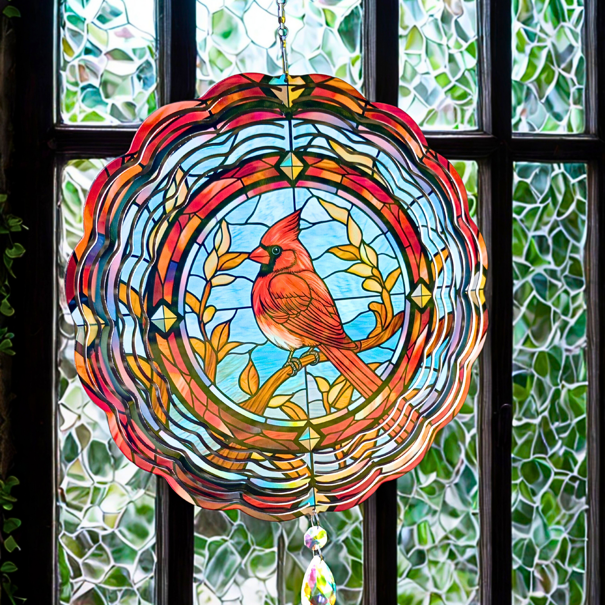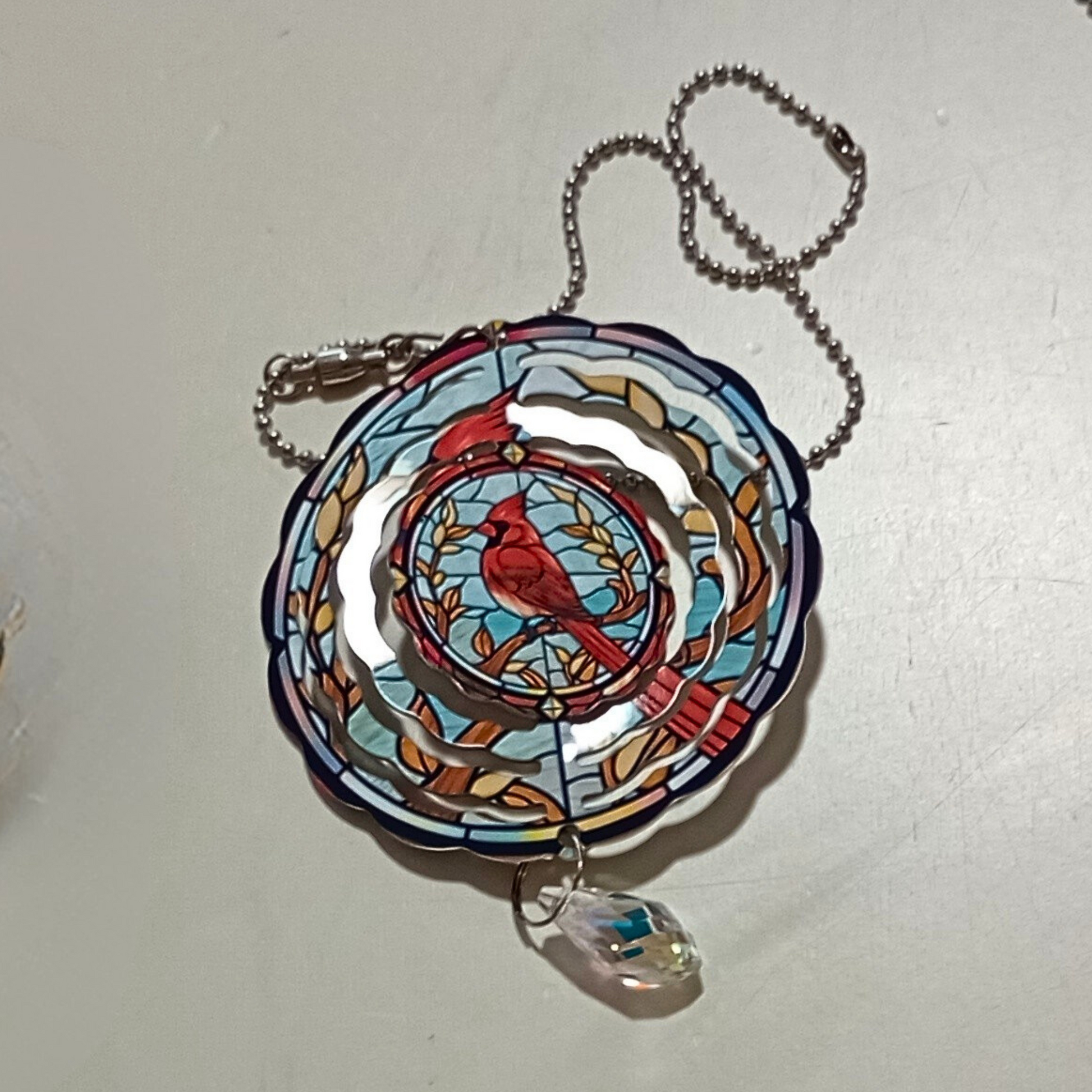 This striking red bird perches gracefully on a branch, framed by leaves in a beautiful stained glass design. Comes ready to display with an attached swivel hook and a beautifully faceted glass suncatcher at the base.. The 3-inch rearview mirror comes ready to hang with a 12-inch ball chain and a charming small glass decoration.