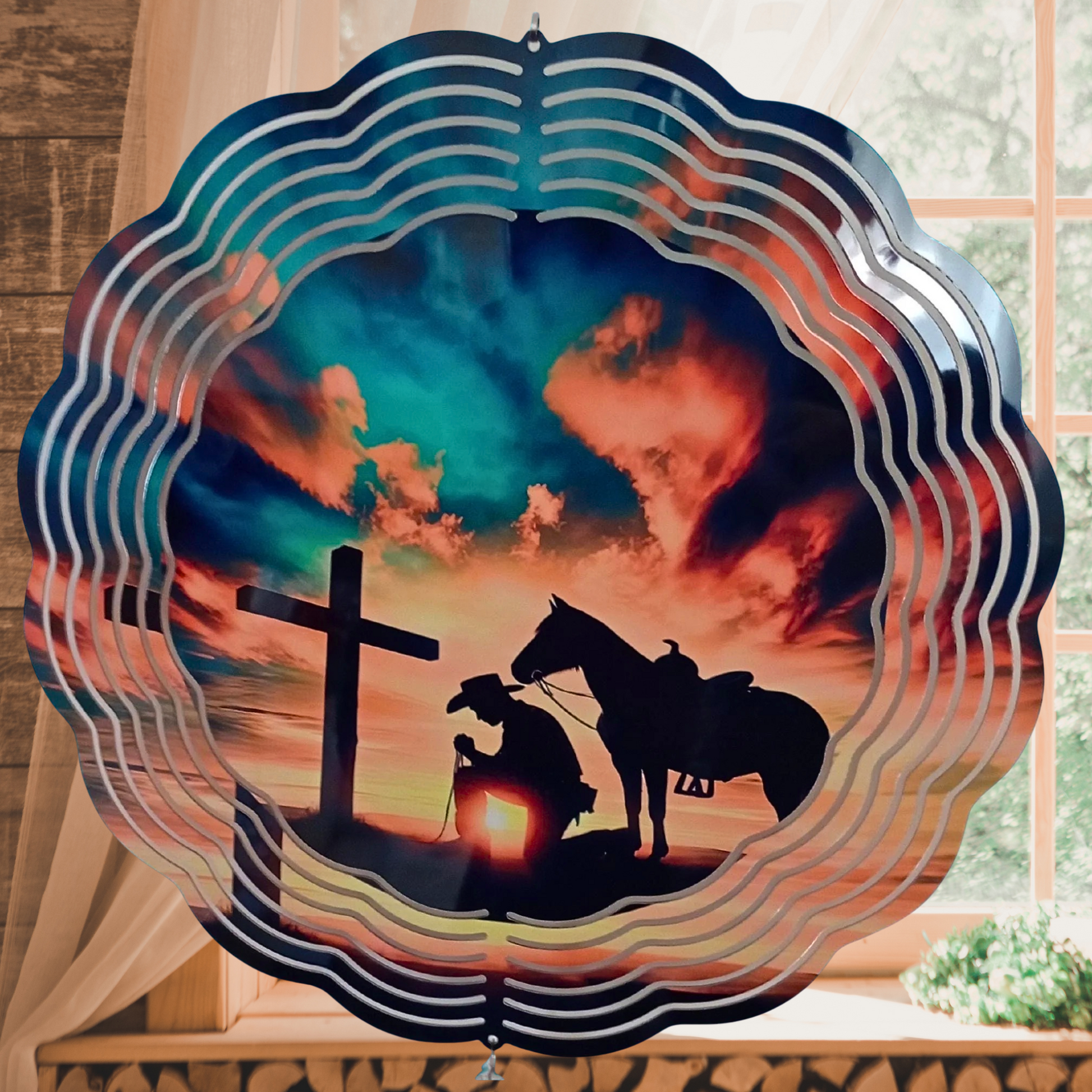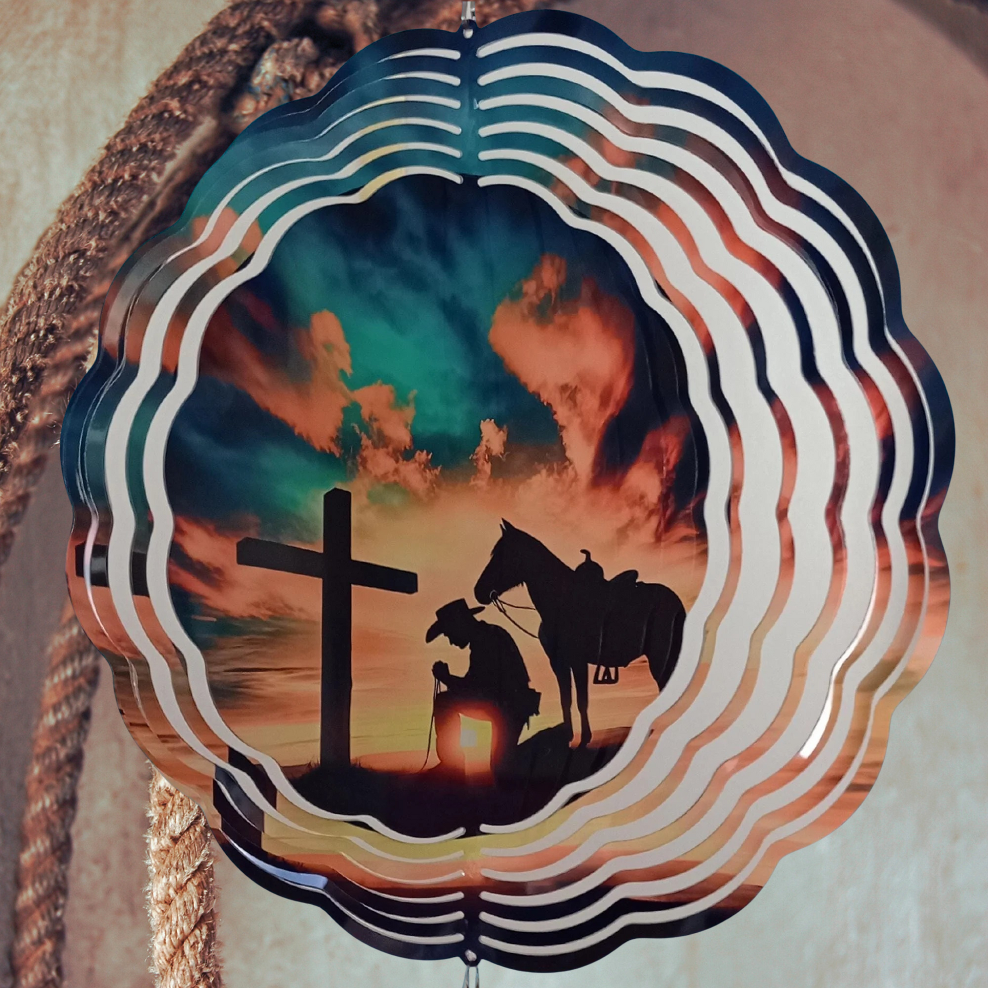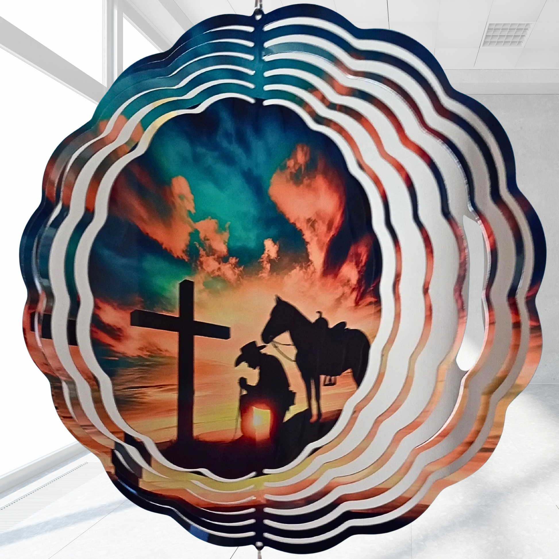 Capture the spirit of the West with this Cowboy Prayer wind spinner, featuring a cowboy and his horse kneeling at a cross beneath a stunning, colorful sky. Designed to hang easily from a swivel hook, it includes a sparkling faceted crystal suncatcher. The 3-inch spinner attaches to a swivel with a 12-inch ball chain and features a delicate glass bead hanging gracefully from the bottom, making it perfect for rearview mirrors or any spot that needs a touch of heartfelt charm.