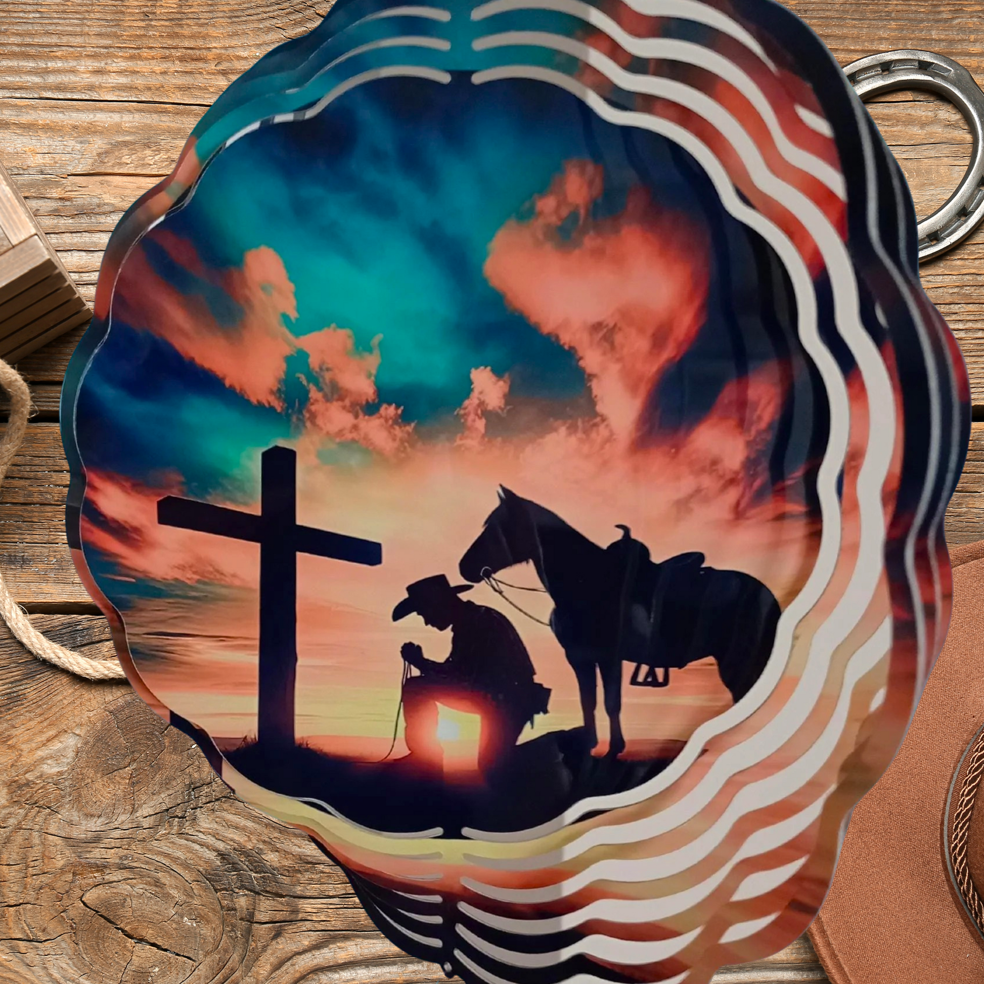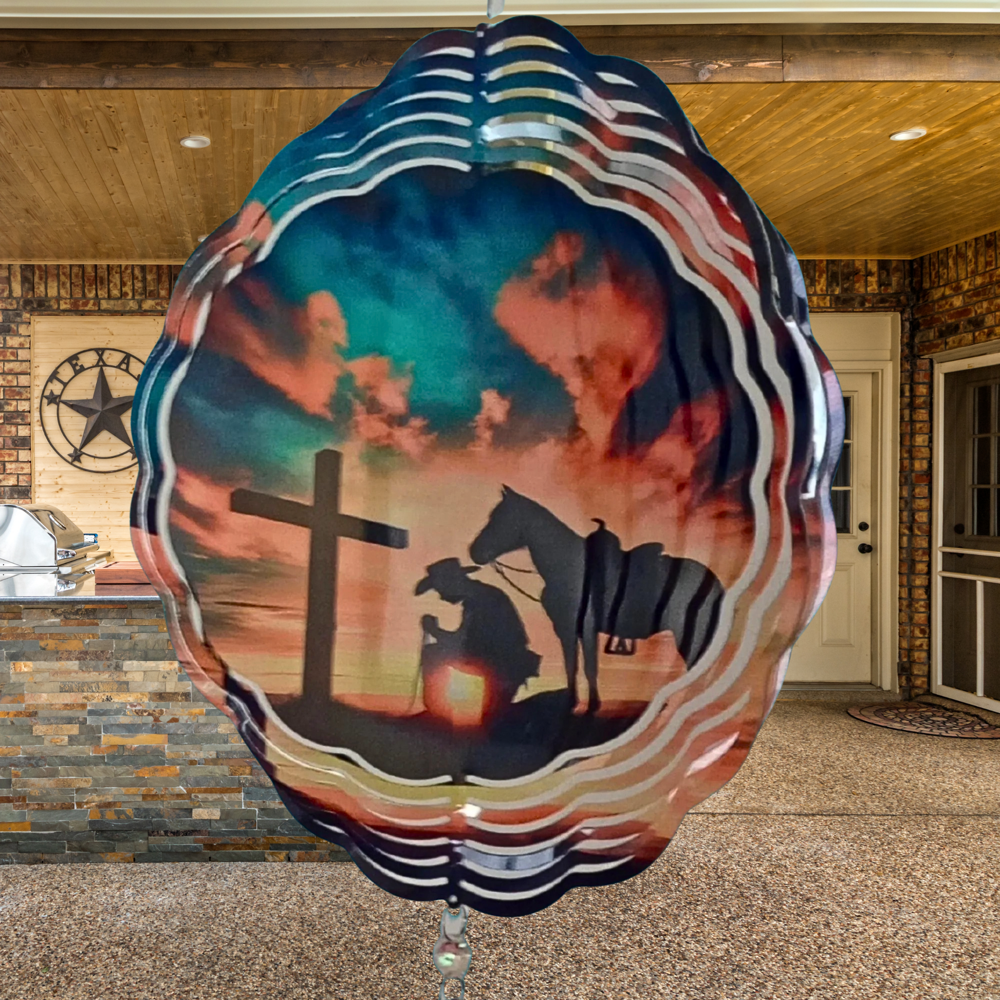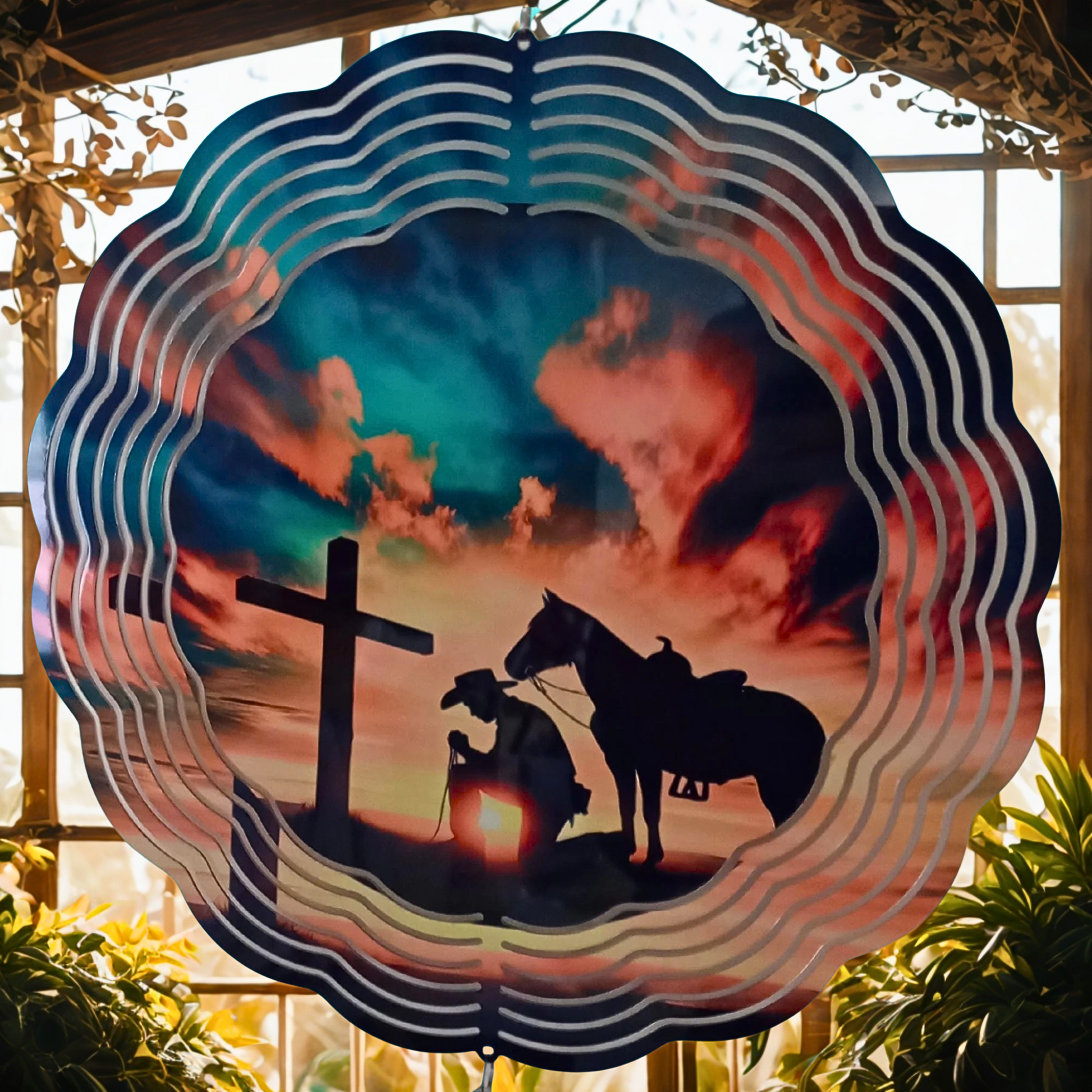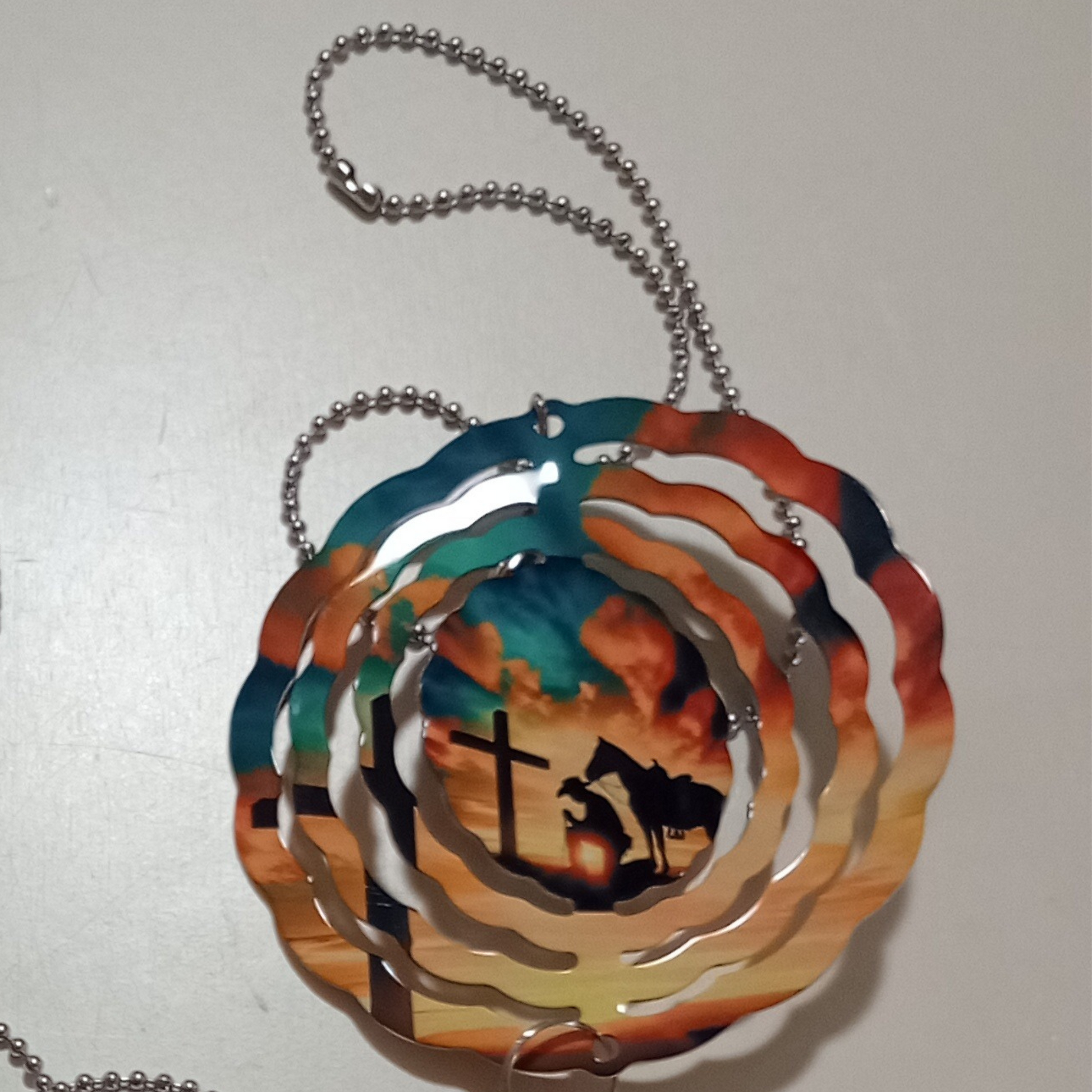 Capture the spirit of the West with this Cowboy Prayer wind spinner, featuring a cowboy and his horse kneeling at a cross beneath a stunning, colorful sky. Designed to hang easily from a swivel hook, it includes a sparkling faceted crystal suncatcher. The 3-inch spinner attaches to a swivel with a 12-inch ball chain and features a delicate glass bead hanging gracefully from the bottom, making it perfect for rearview mirrors or any spot that needs a touch of heartfelt charm.