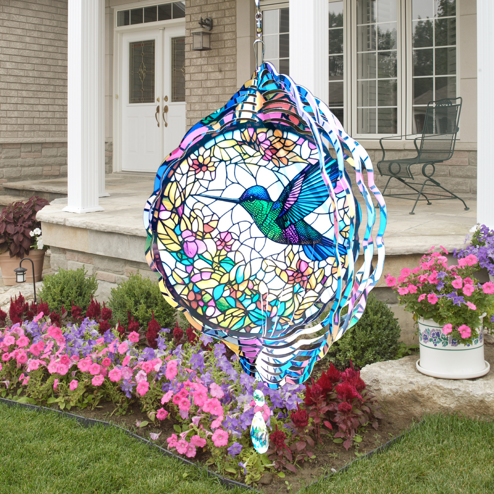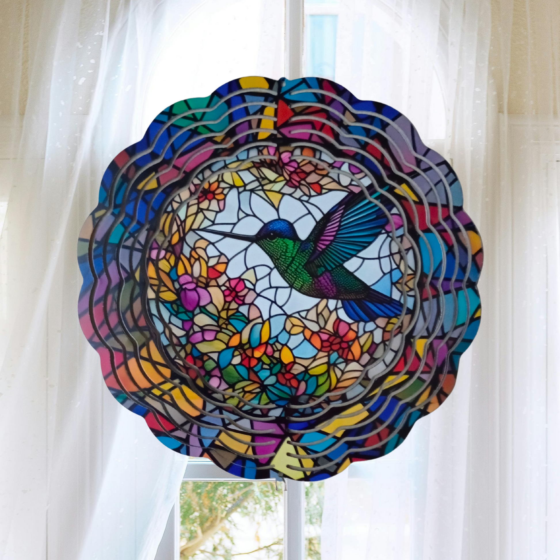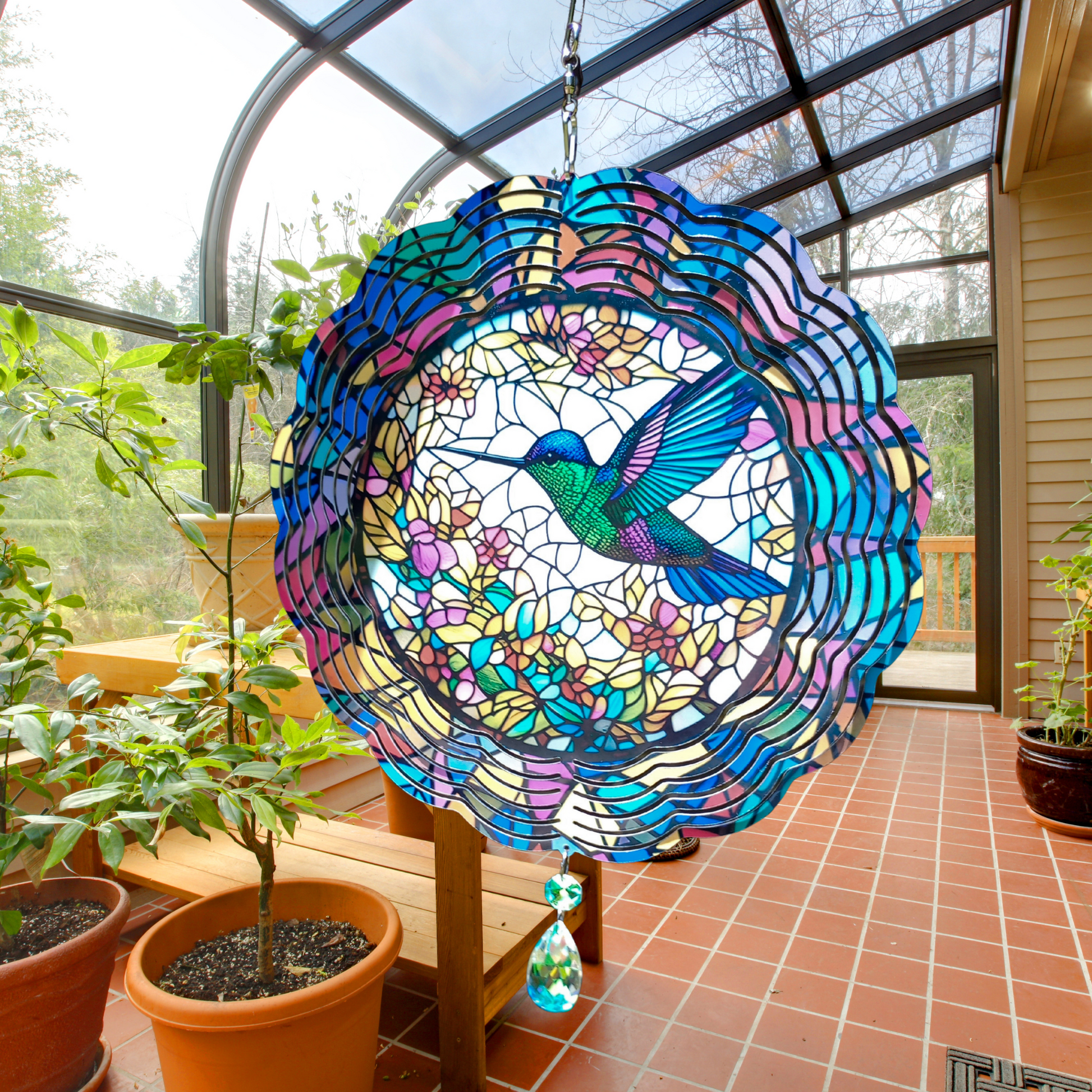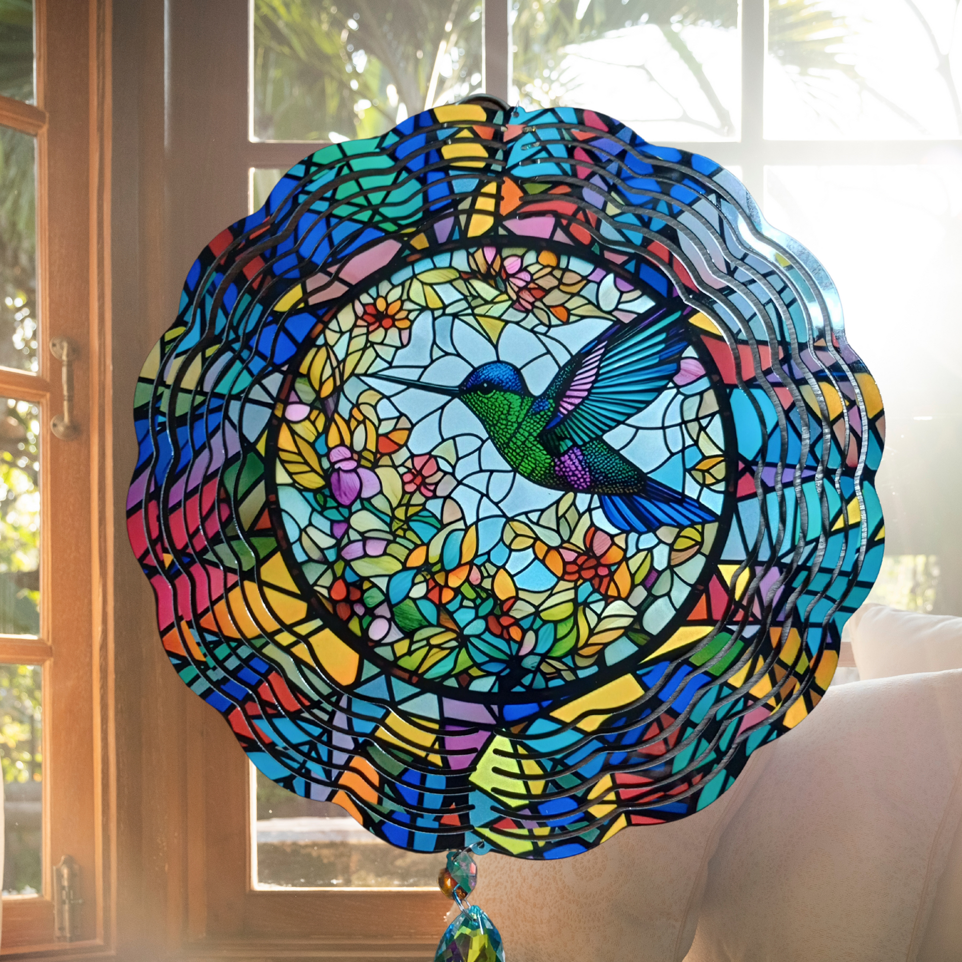 This vibrant spinner features a stained glass hummingbird soaring in flight, bursting with green and blue hues. It’s ready to hang and includes a sparkling faceted suncatcher crystal.
