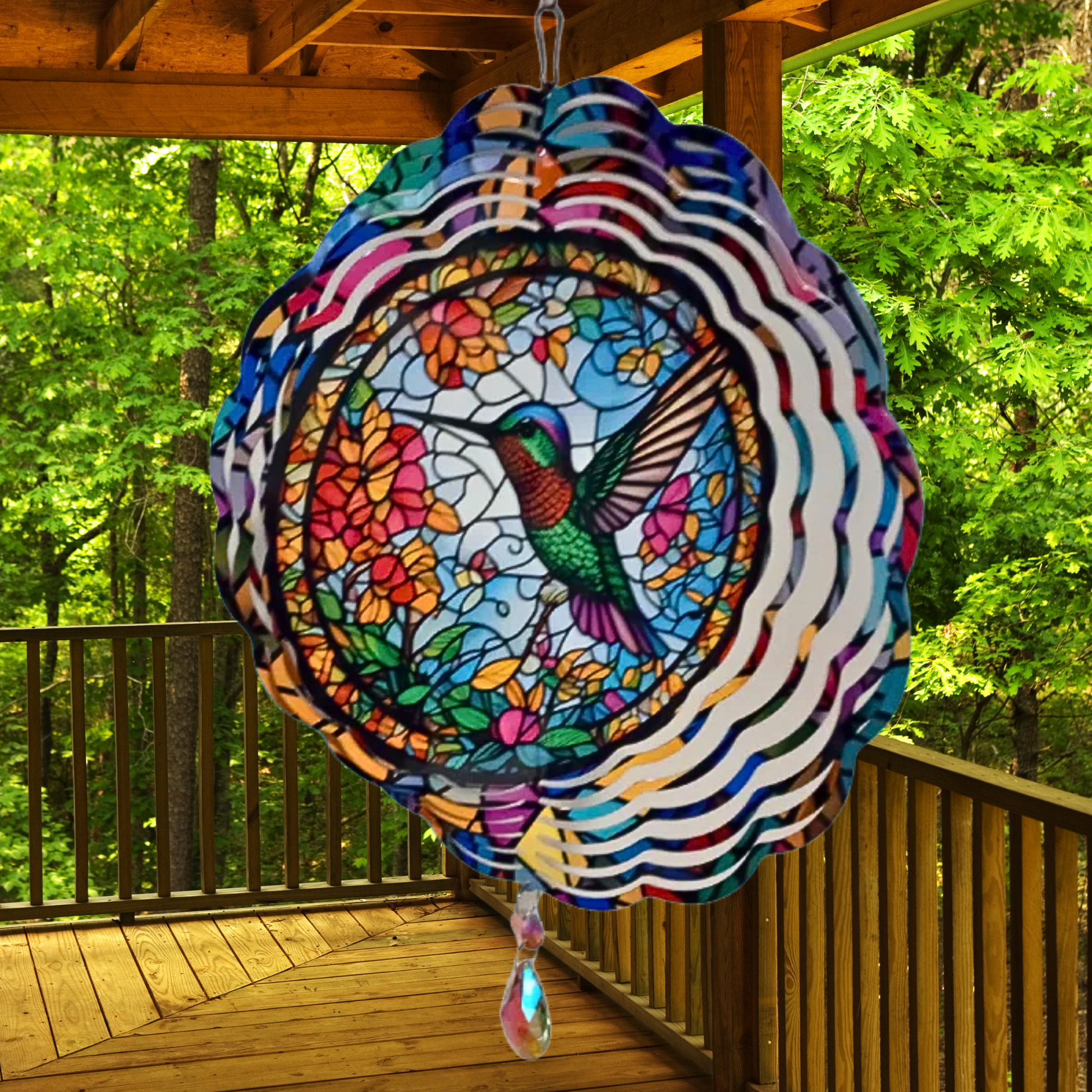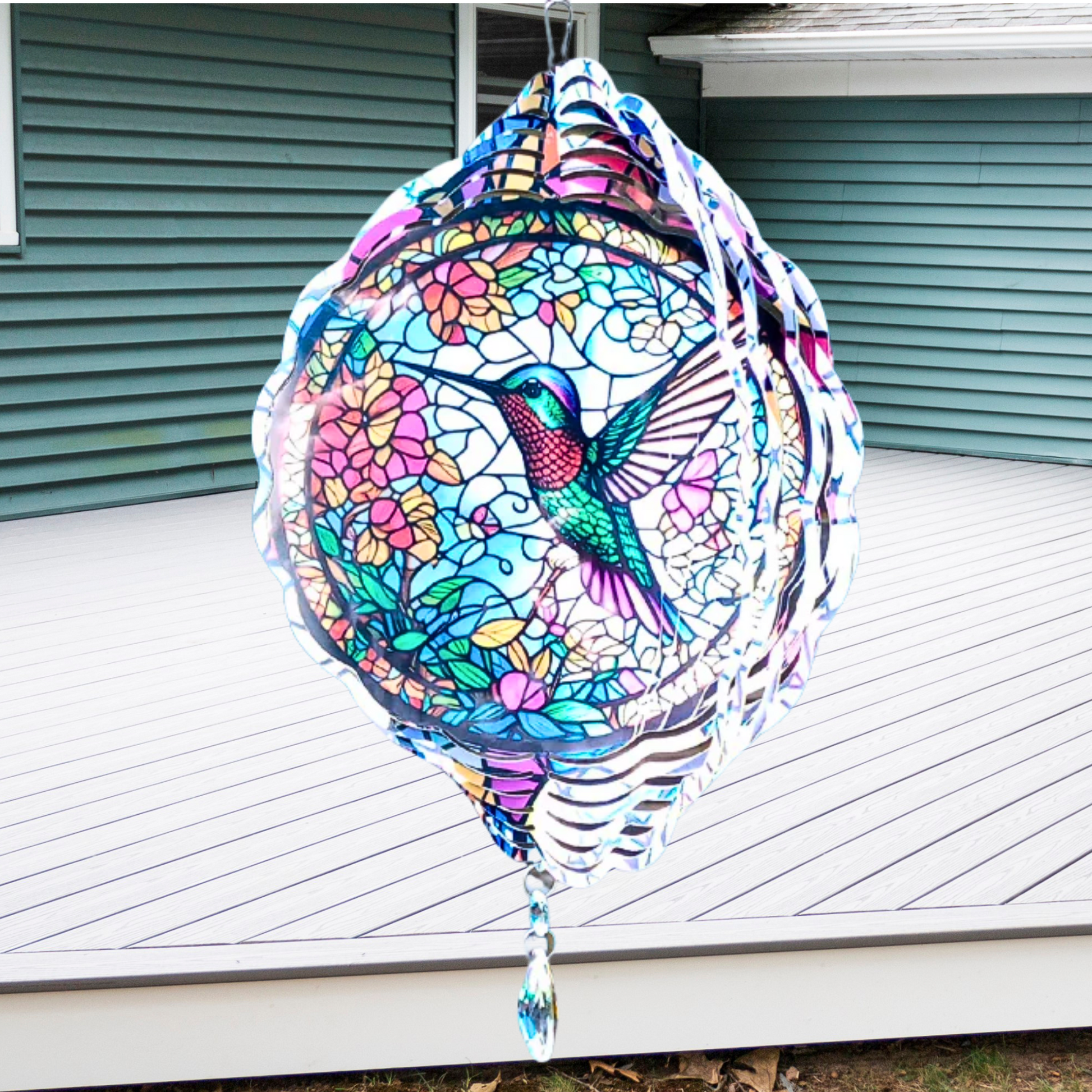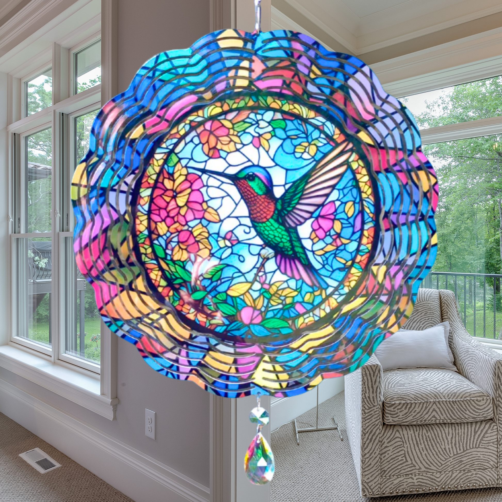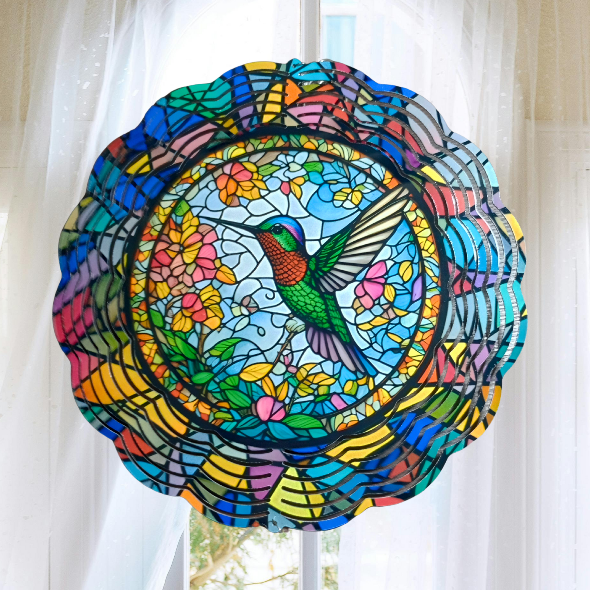 This green and red hummingbird wind spinner features a vibrant stained glass design that captures attention with its lively colors. It’s ready to hang with a swivel hook and includes a sparkling suncatcher crystal dangling from the bottom. The rearview mirror-sized spinner comes equipped with a swivel and a 12-inch ball chain for easy display. Add a touch of color and charm to your space with this eye-catching decoration.