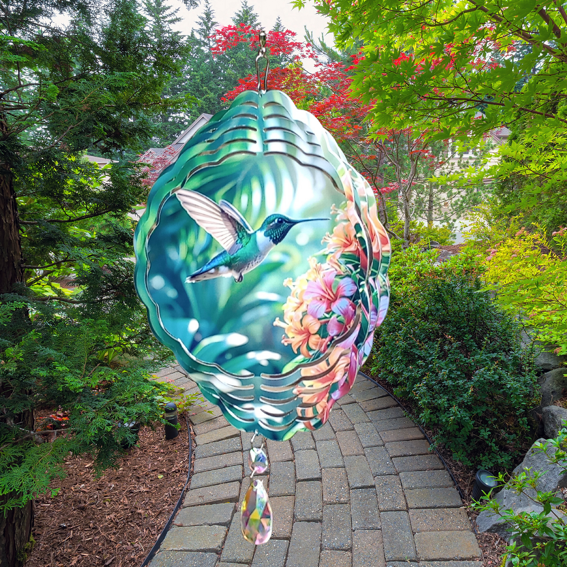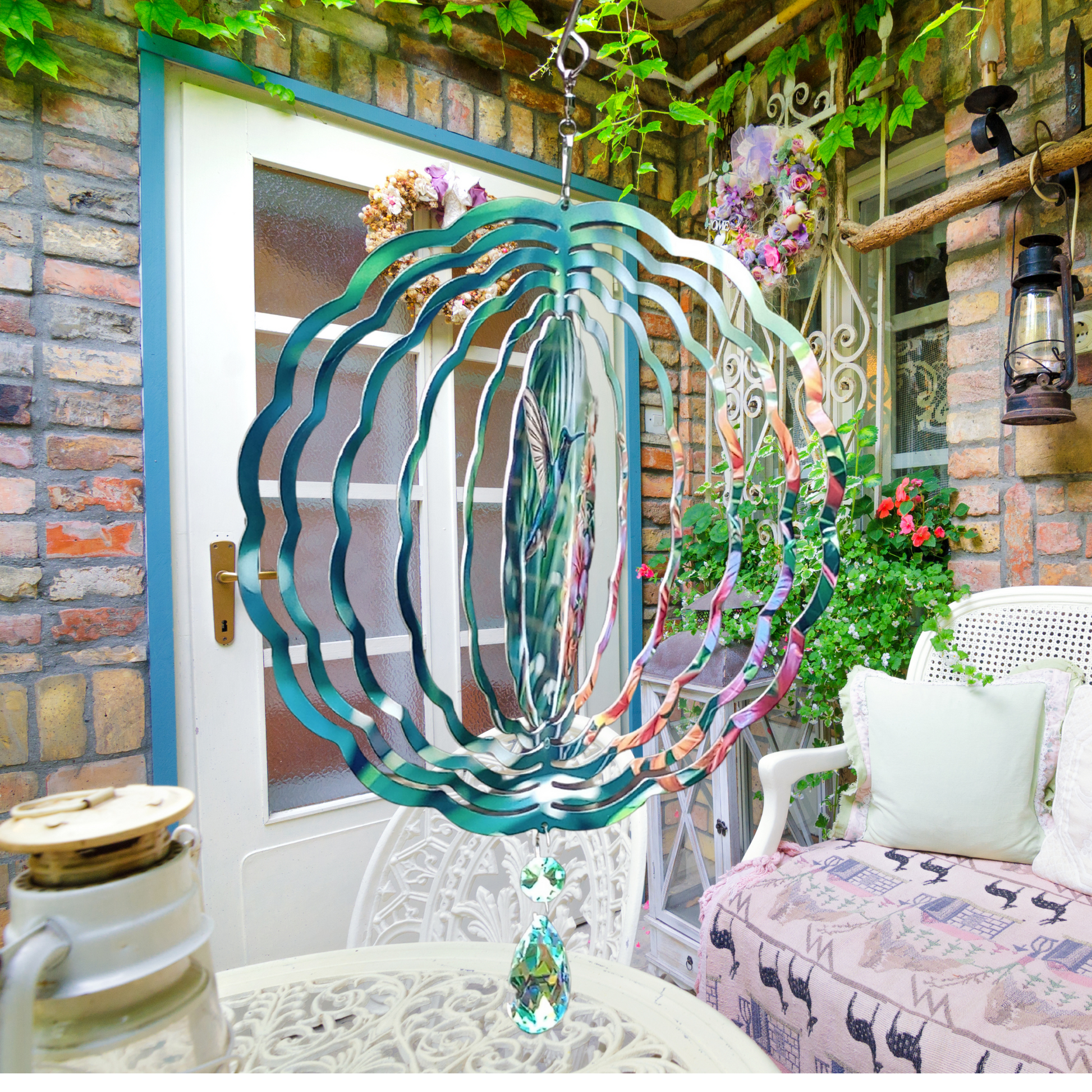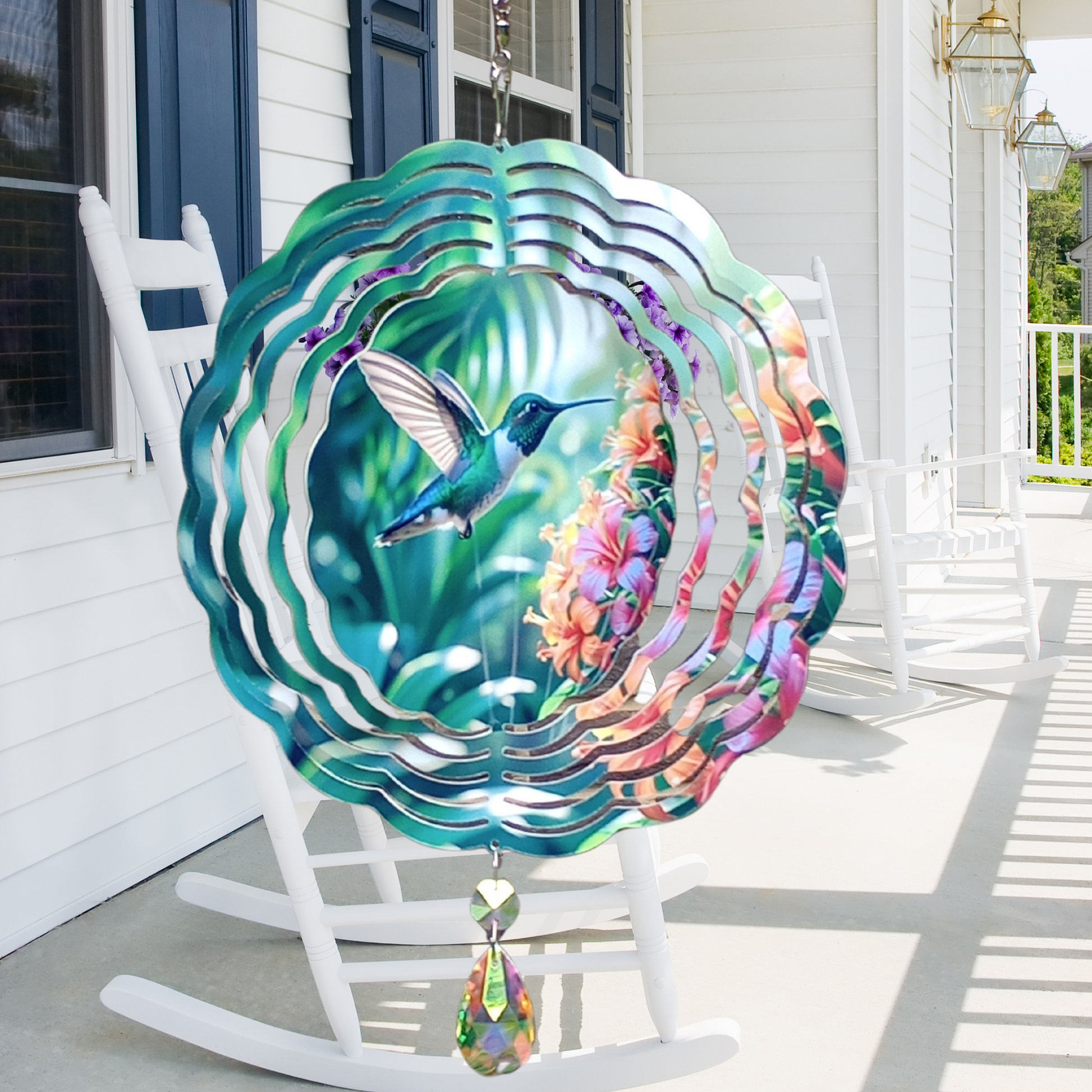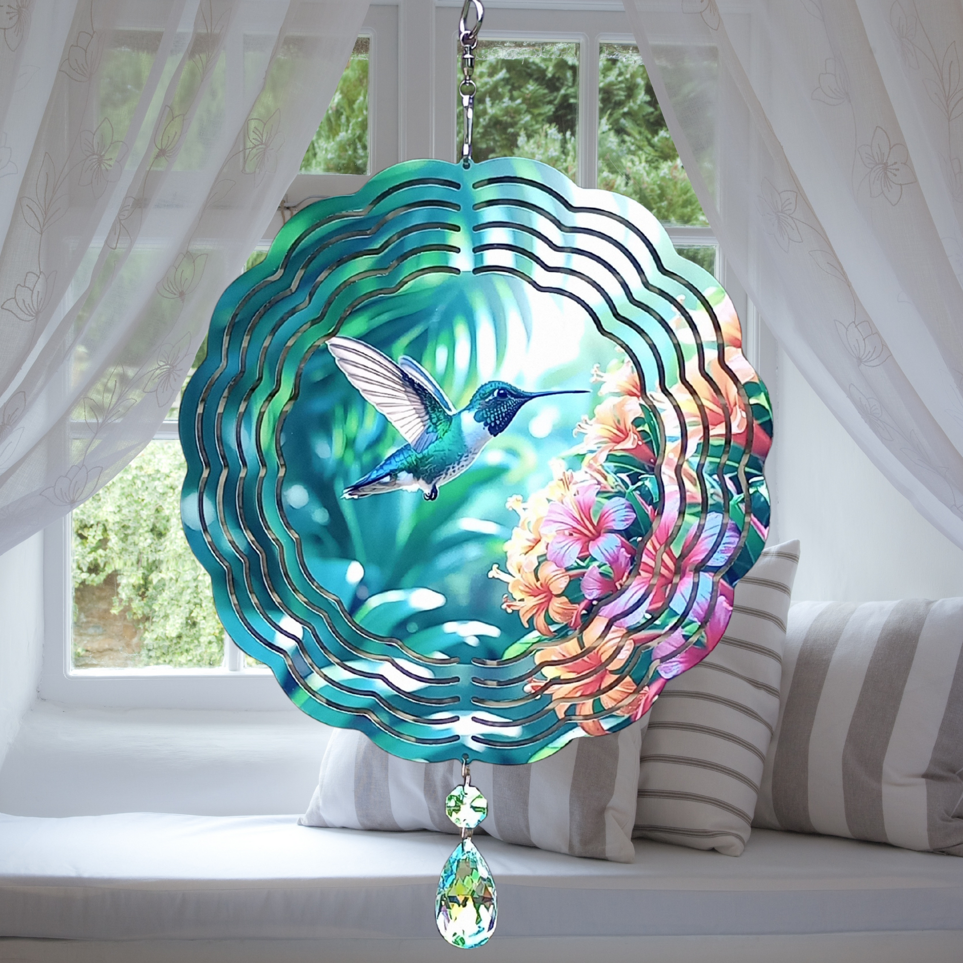 This beautiful wind spinner showcases a vibrant hummingbird alongside blossoming flowers in striking teal and green hues. Equipped with a swivel hook for easy hanging, it also includes a dazzling suncatcher crystal that enhances its enchanting appeal.