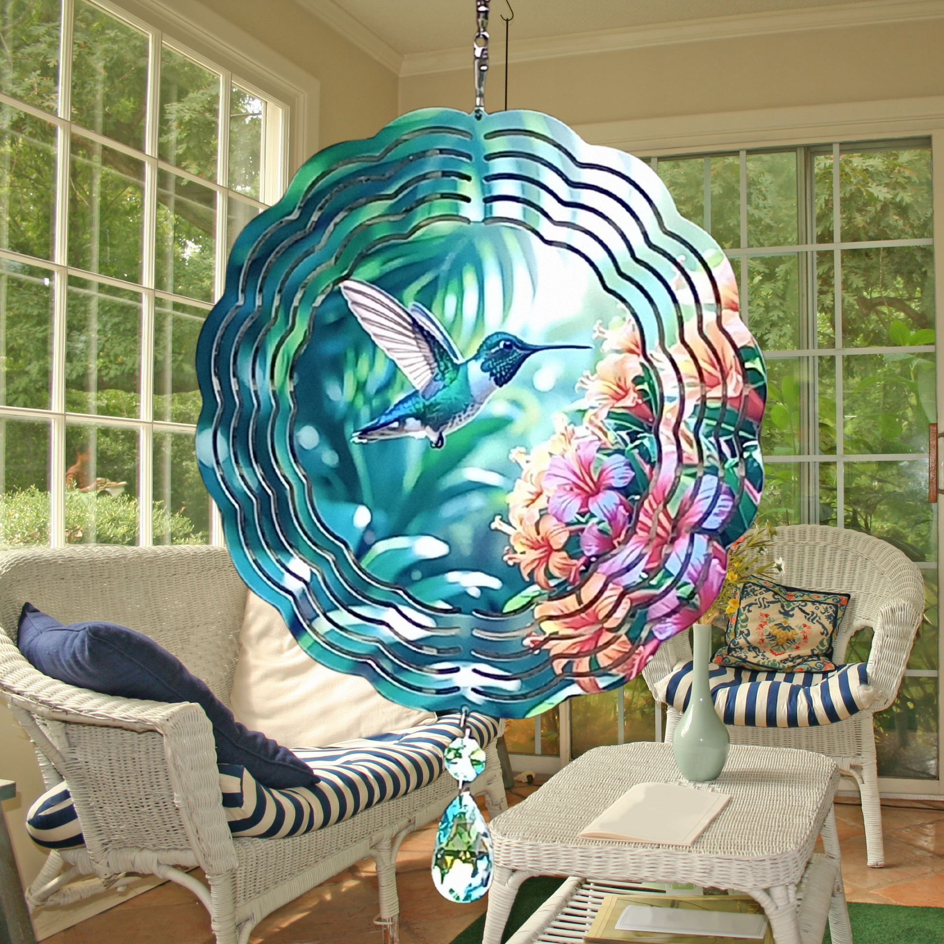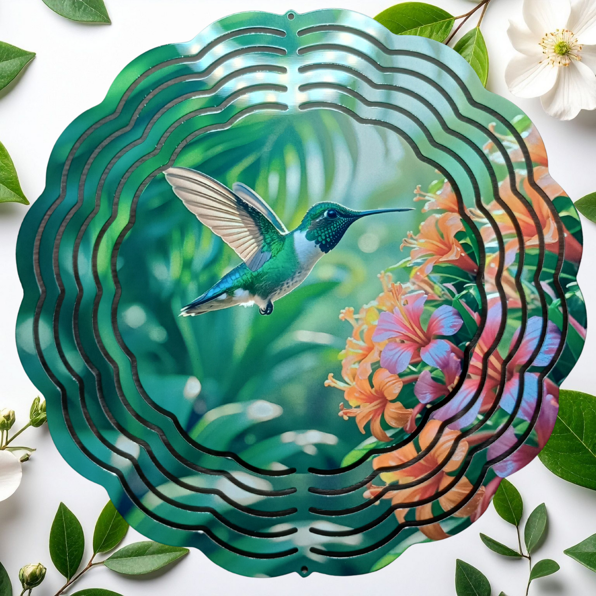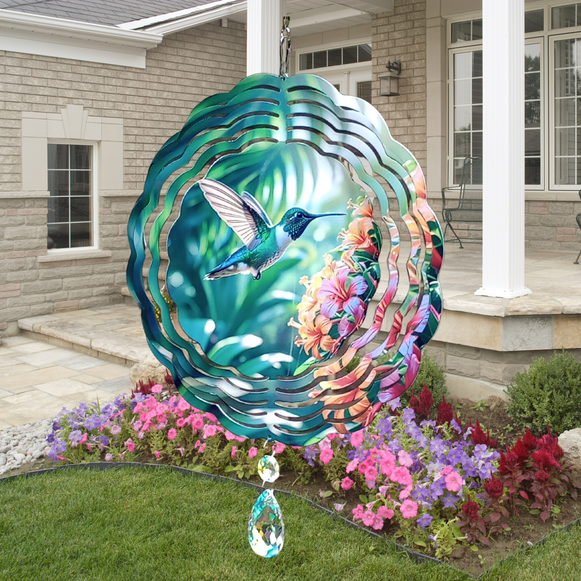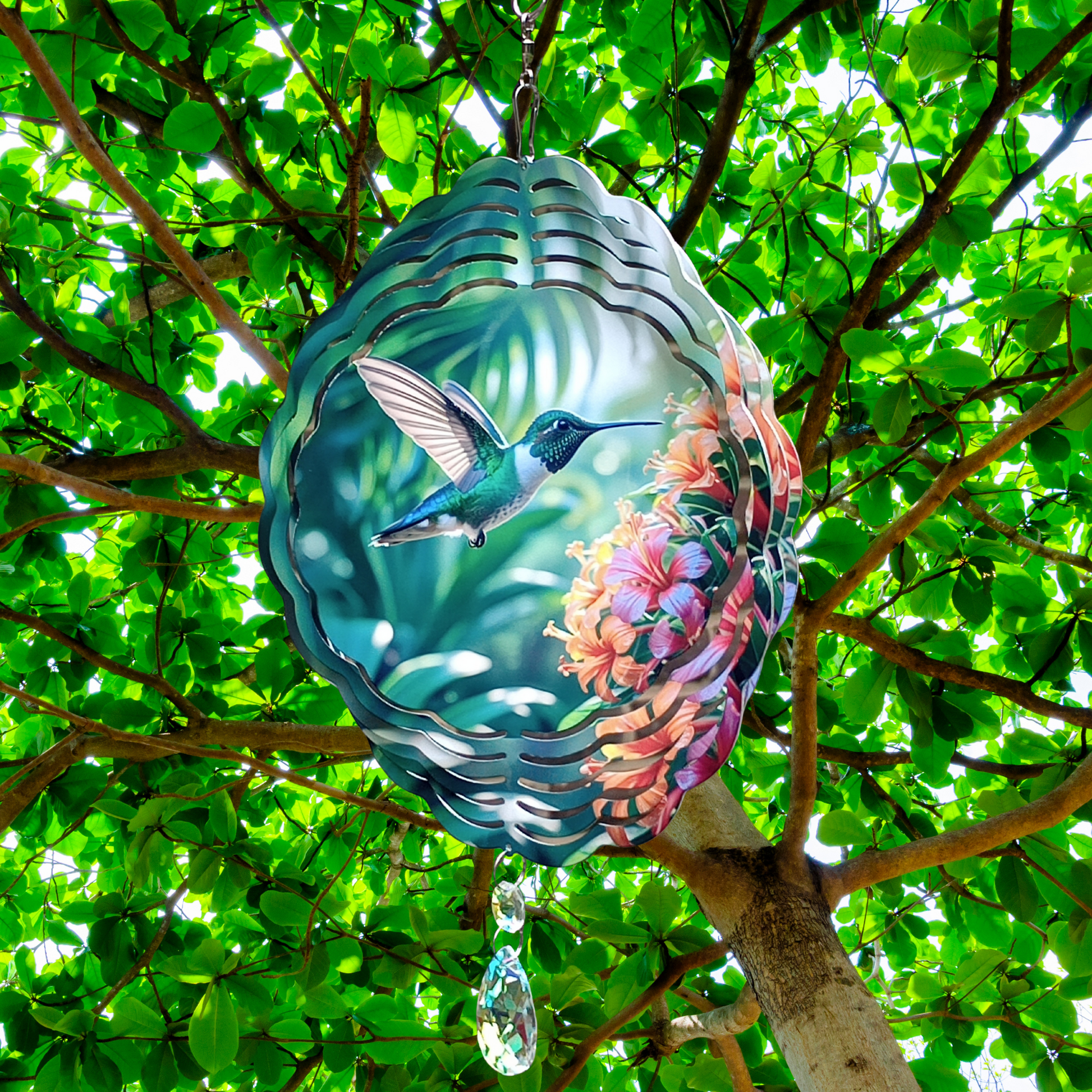 This beautiful wind spinner showcases a vibrant hummingbird alongside blossoming flowers in striking teal and green hues. Equipped with a swivel hook for easy hanging, it also includes a dazzling suncatcher crystal that enhances its enchanting appeal.