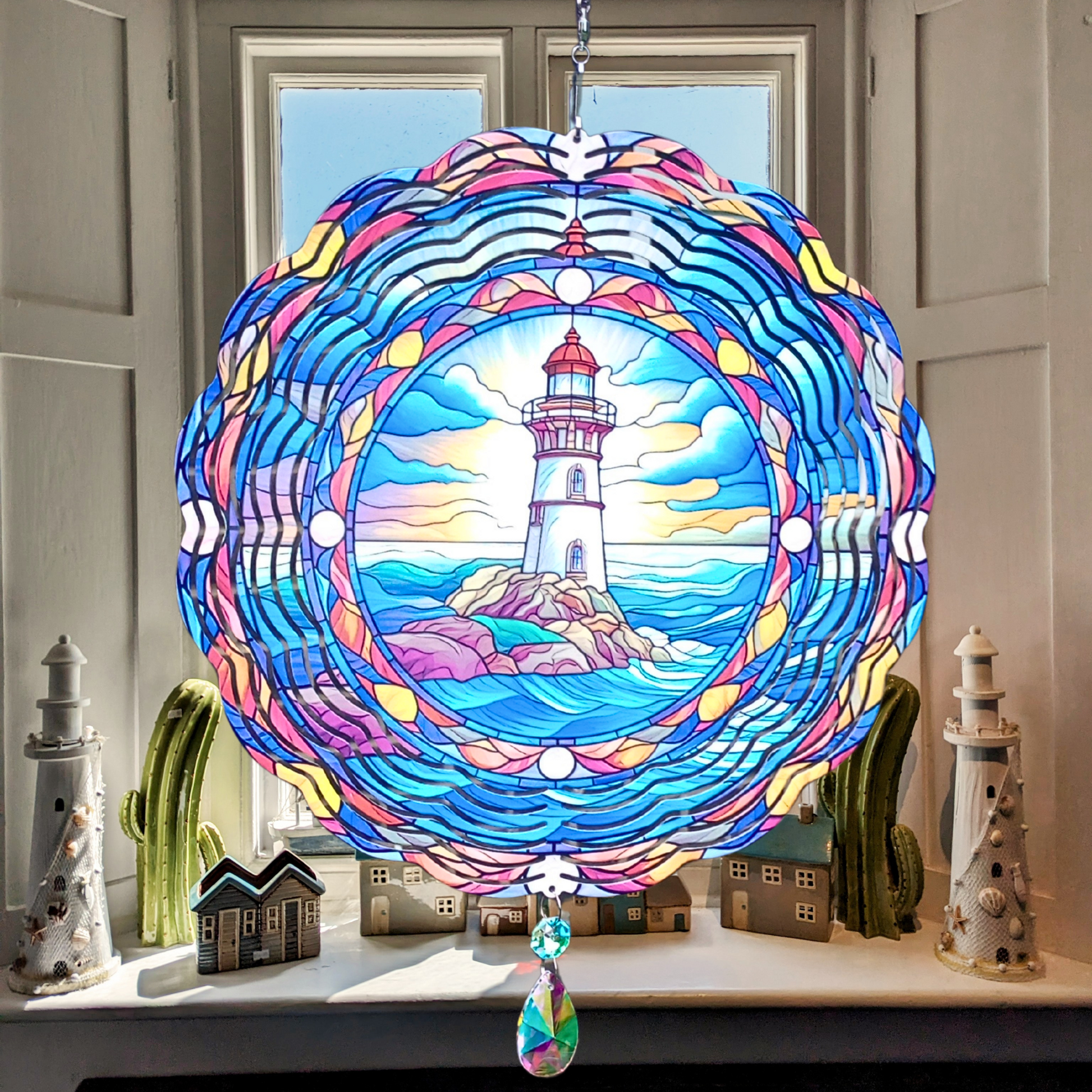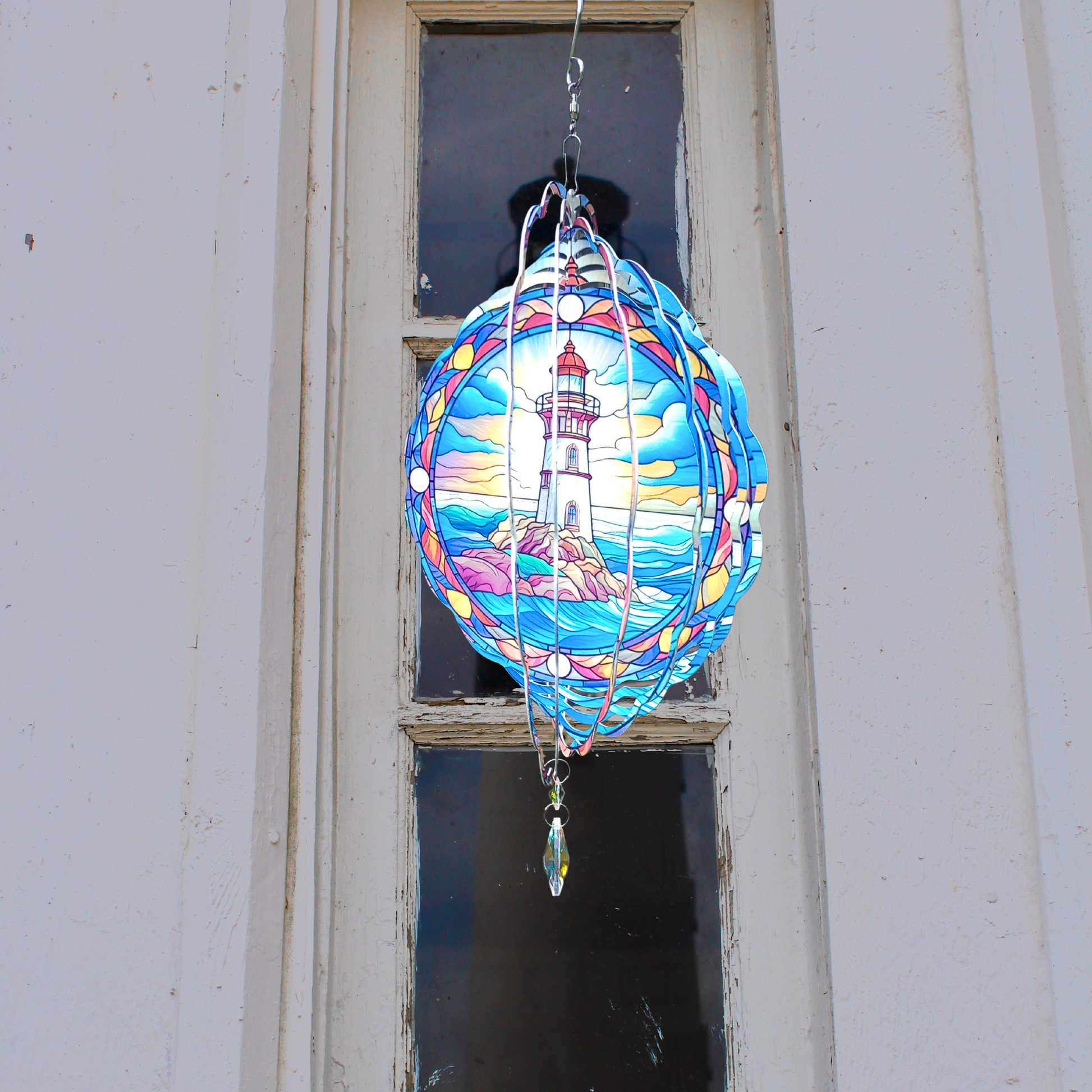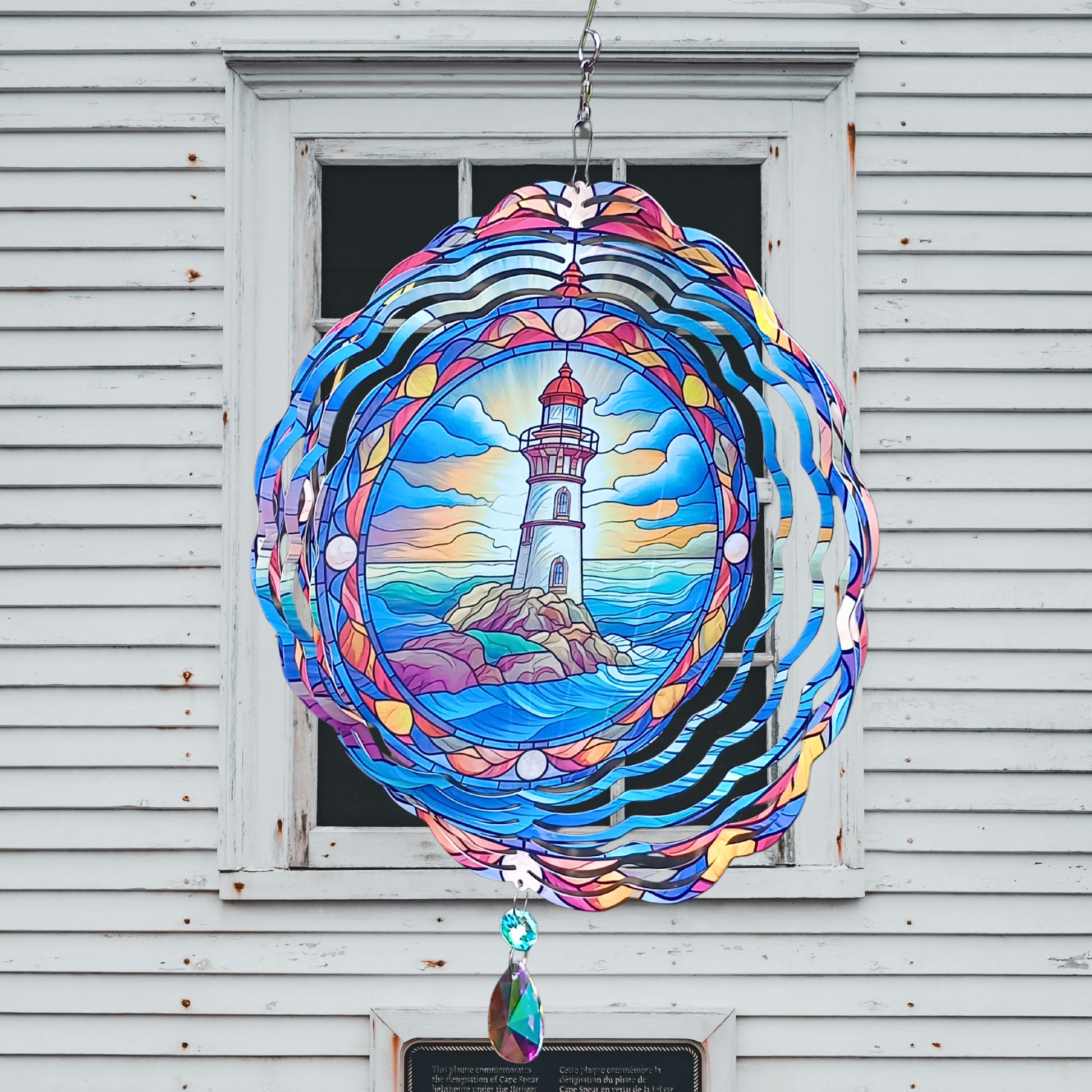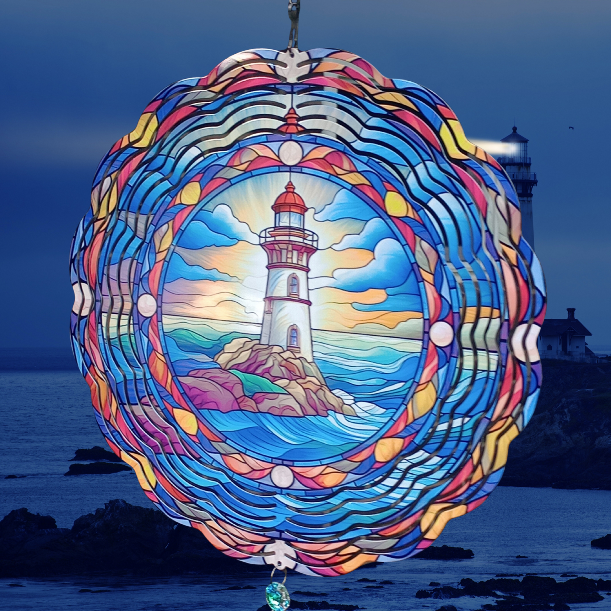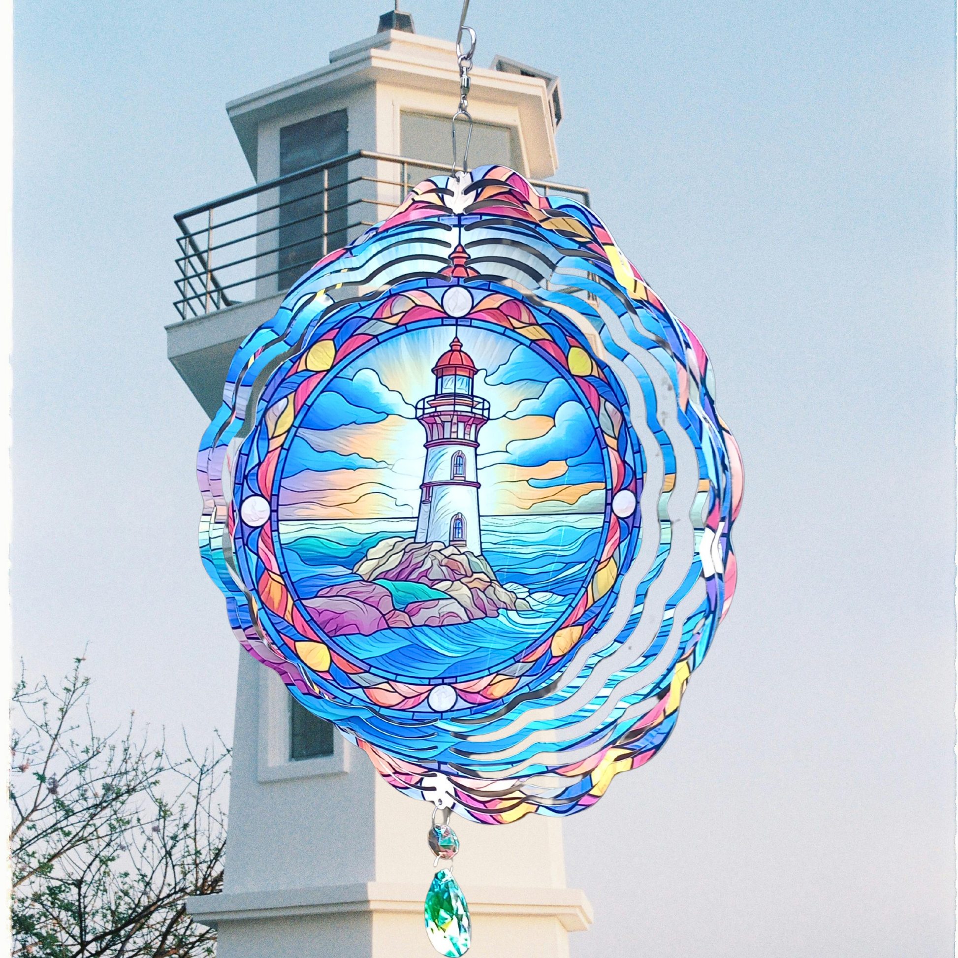 Capture the serene beauty of the coast with this Lighthouse wind spinner. Featuring a stained glass design of a lighthouse at sunrise in vibrant blue tones, it is framed by a charming nautical border. Ready to hang from a swivel hook, it includes an attached crystal suncatcher that sparkles in the sunlight, adding a magical touch to your outdoor space. Perfect for bringing coastal charm and a splash of color to your garden or porch.