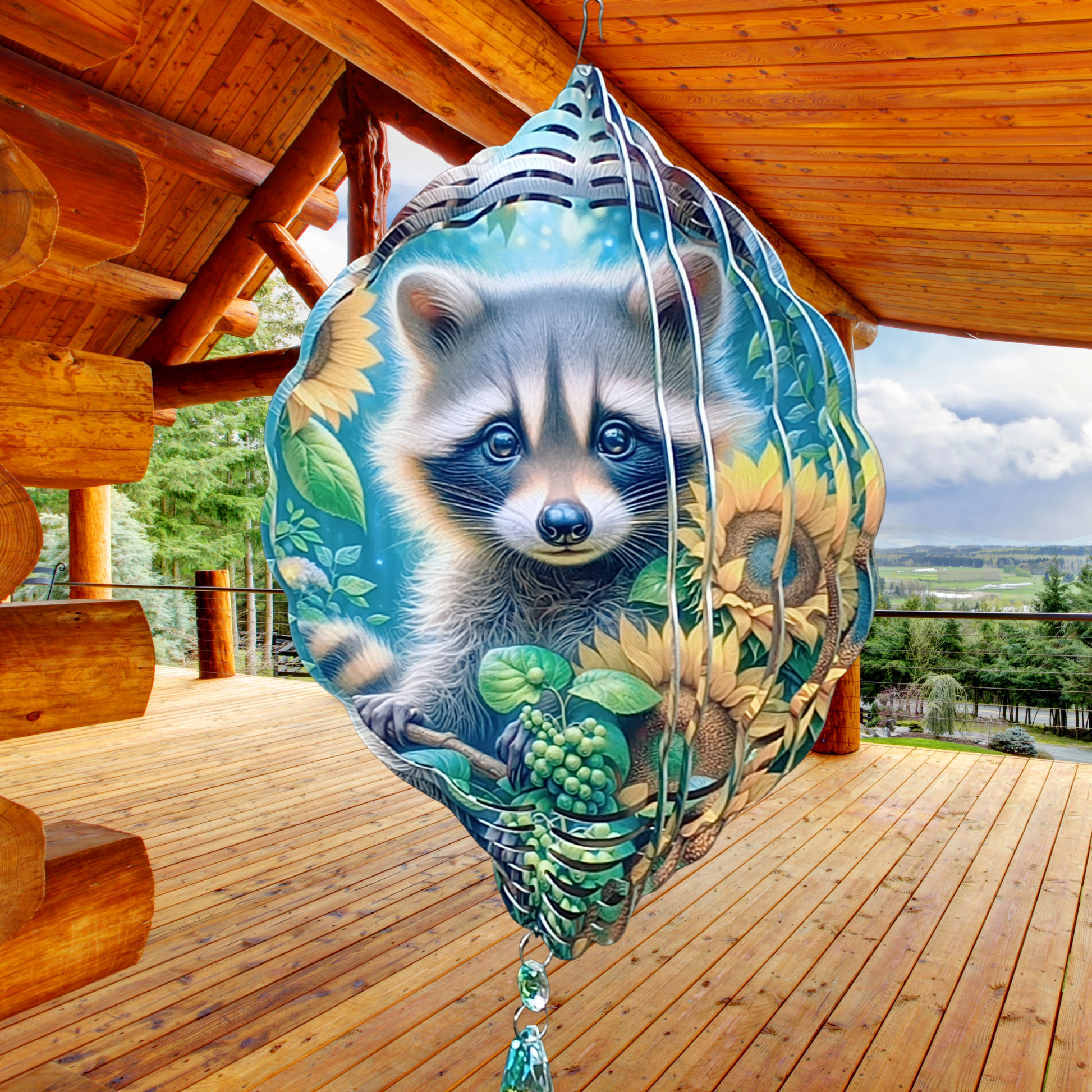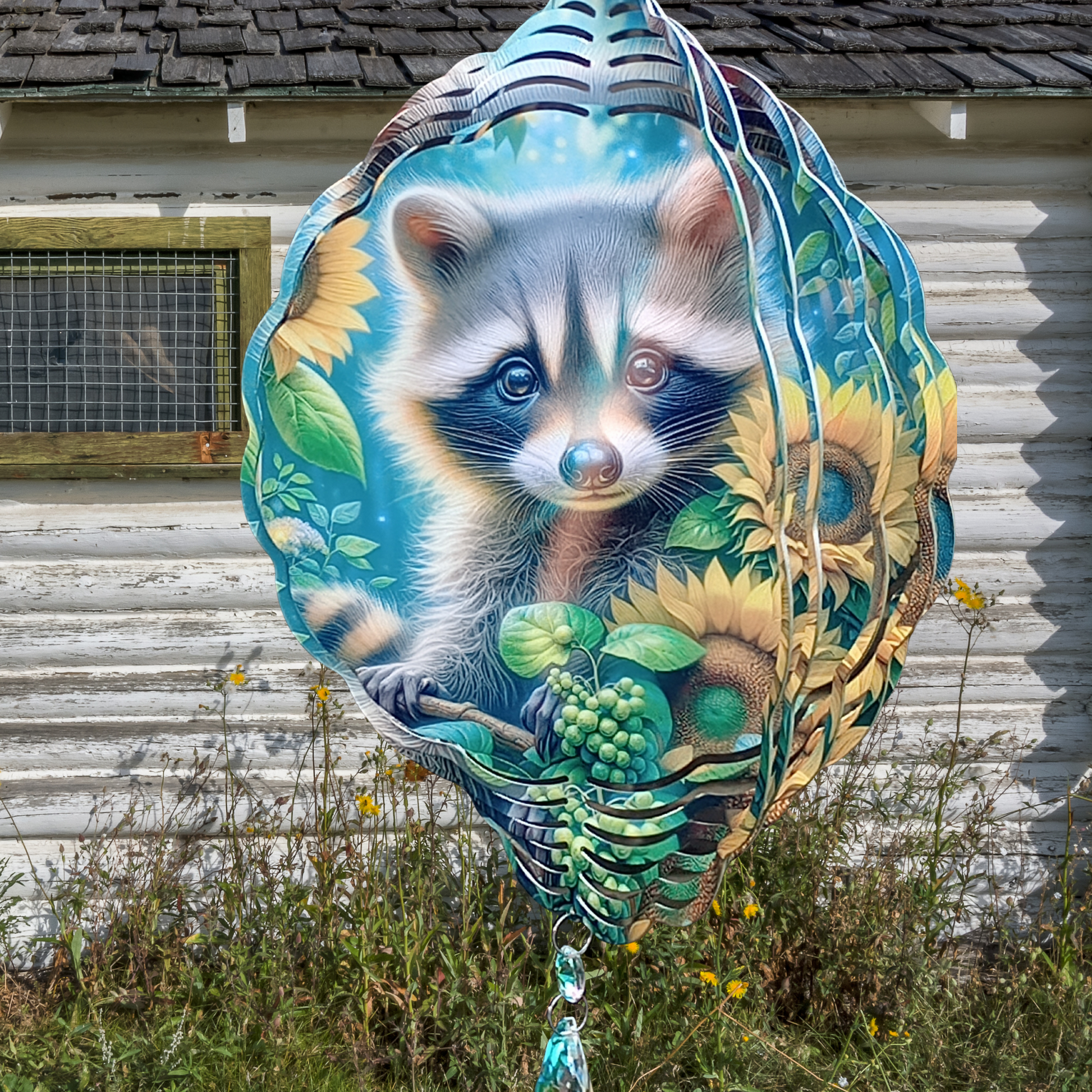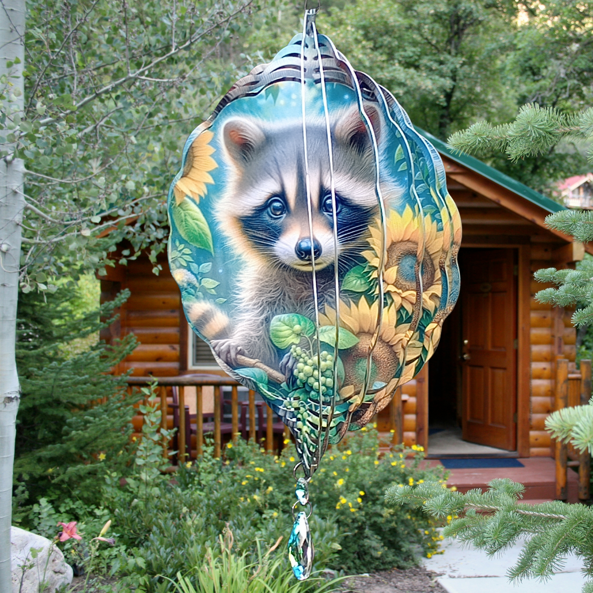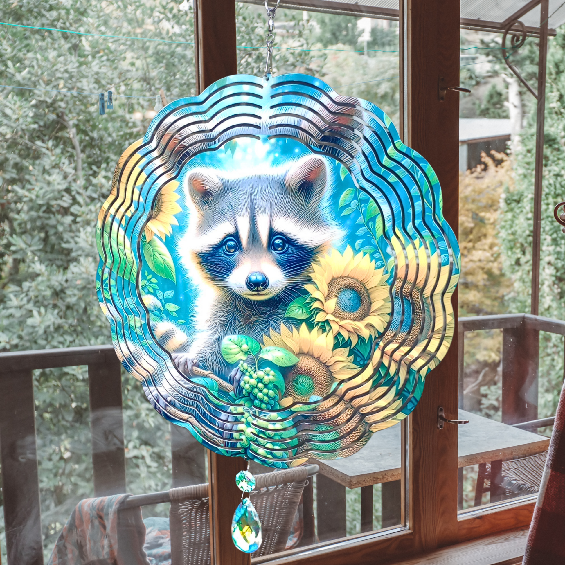 Bring charm and warmth to your outdoor space with this delightful raccoon and sunflowers wind spinner. Featuring a sweet raccoon nestled among vibrant sunflowers, it adds a touch of whimsy and beauty to any garden or porch. Ready to hang from a swivel hook, it includes an attached crystal suncatcher that sparkles in the sunlight, creating captivating reflections. Perfect for adding movement and color, this wind spinner is a charming accent that brightens your surroundings effortlessly.