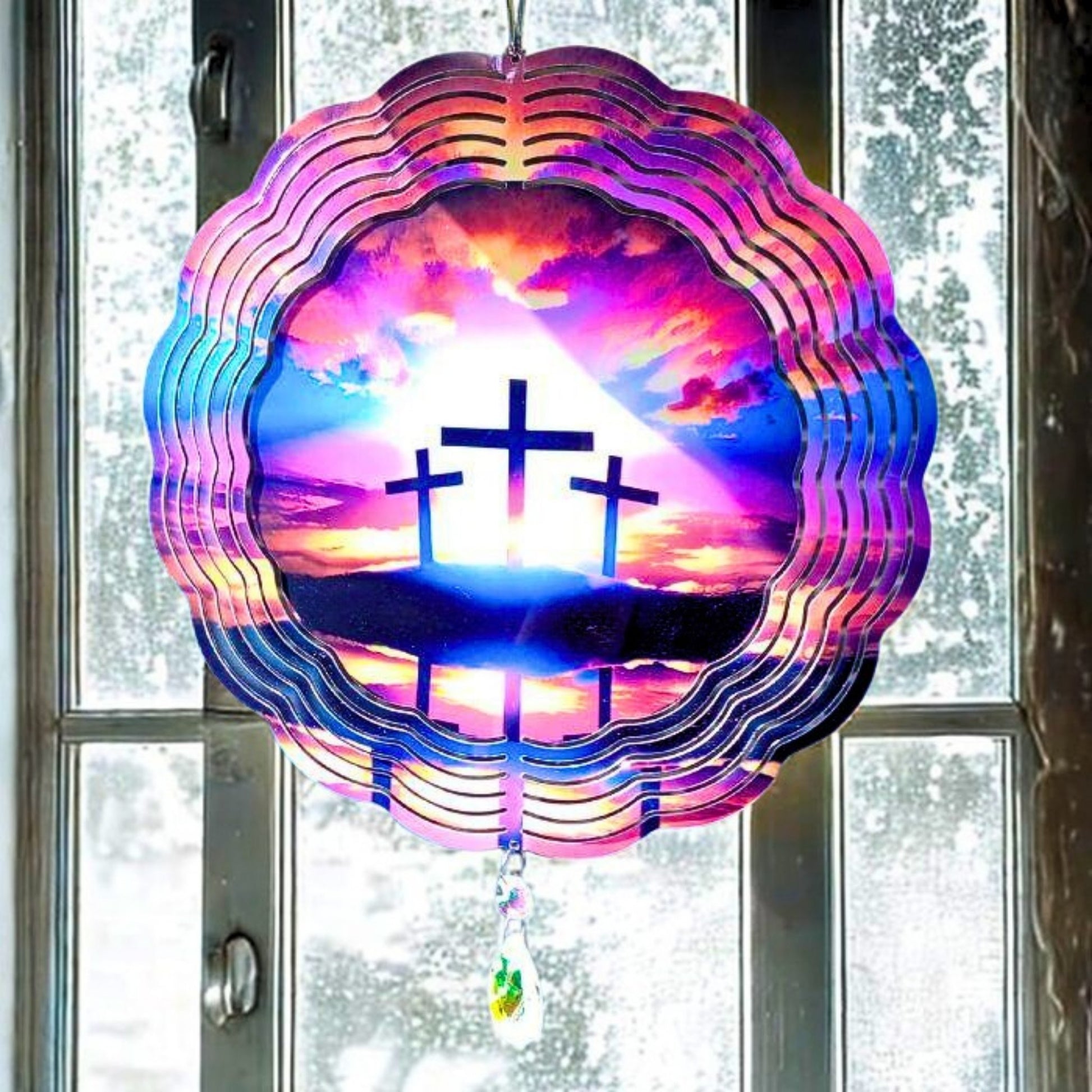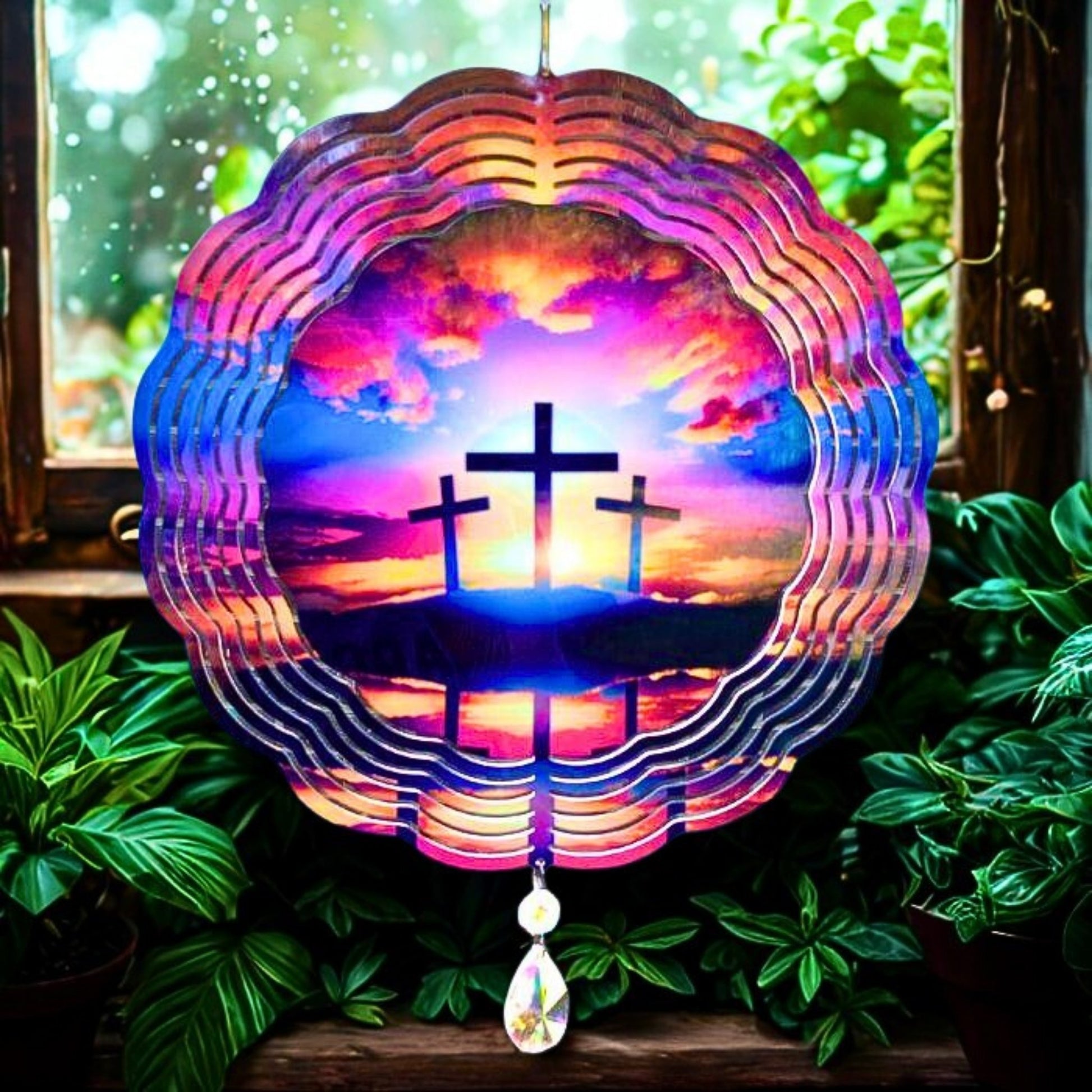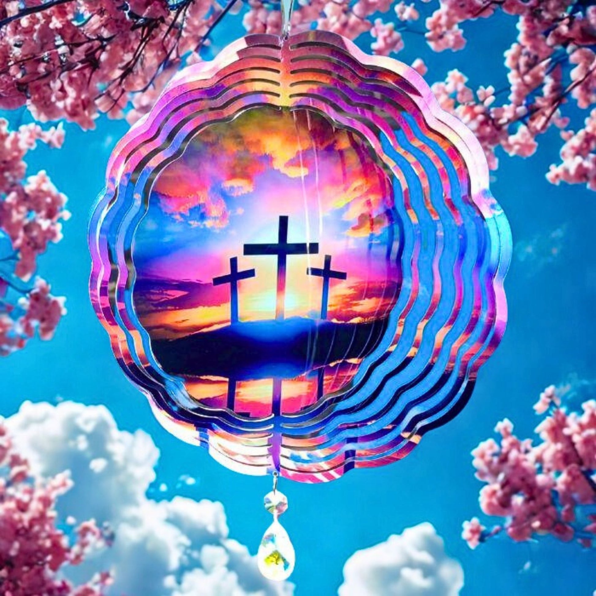 This stunning wind spinner features three crosses set against a vibrant sunrise and a sky painted with multiple colors, mirrored in the foreground. Ready to hang, it is adorned with a sparkling, faceted crystal suncatcher that adds a captivating touch as it sways gently below.