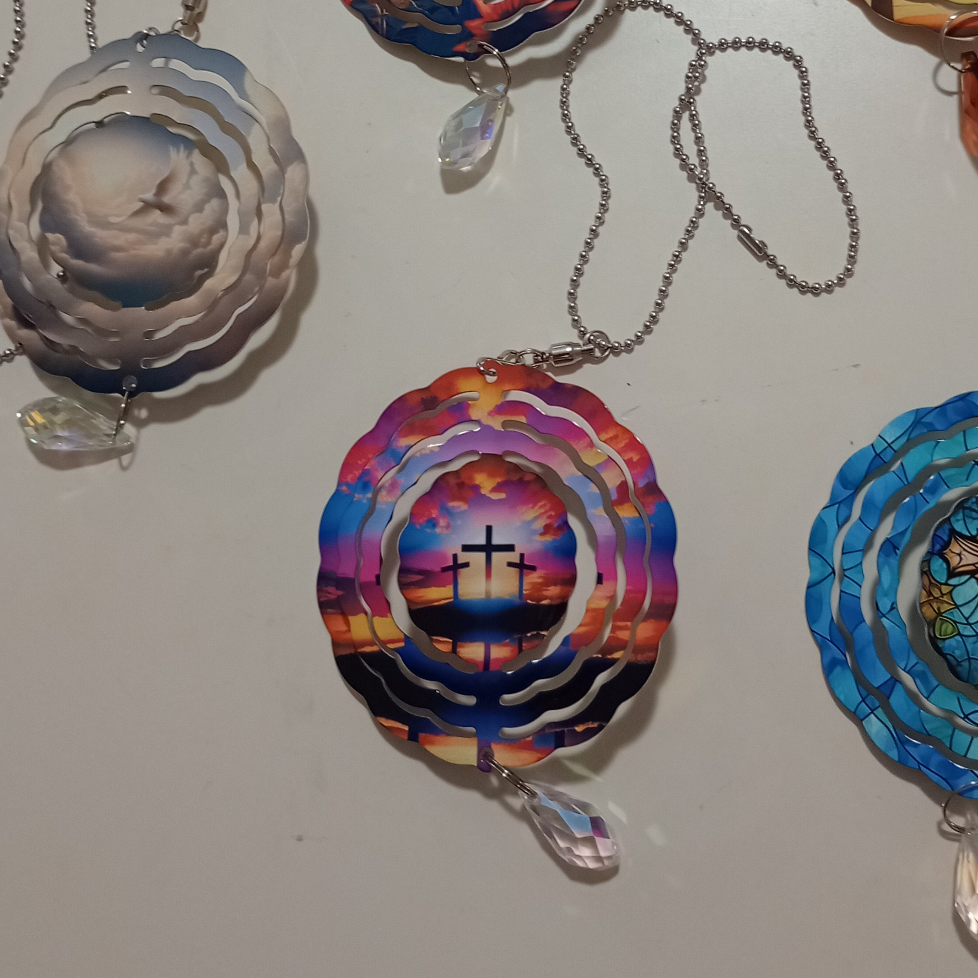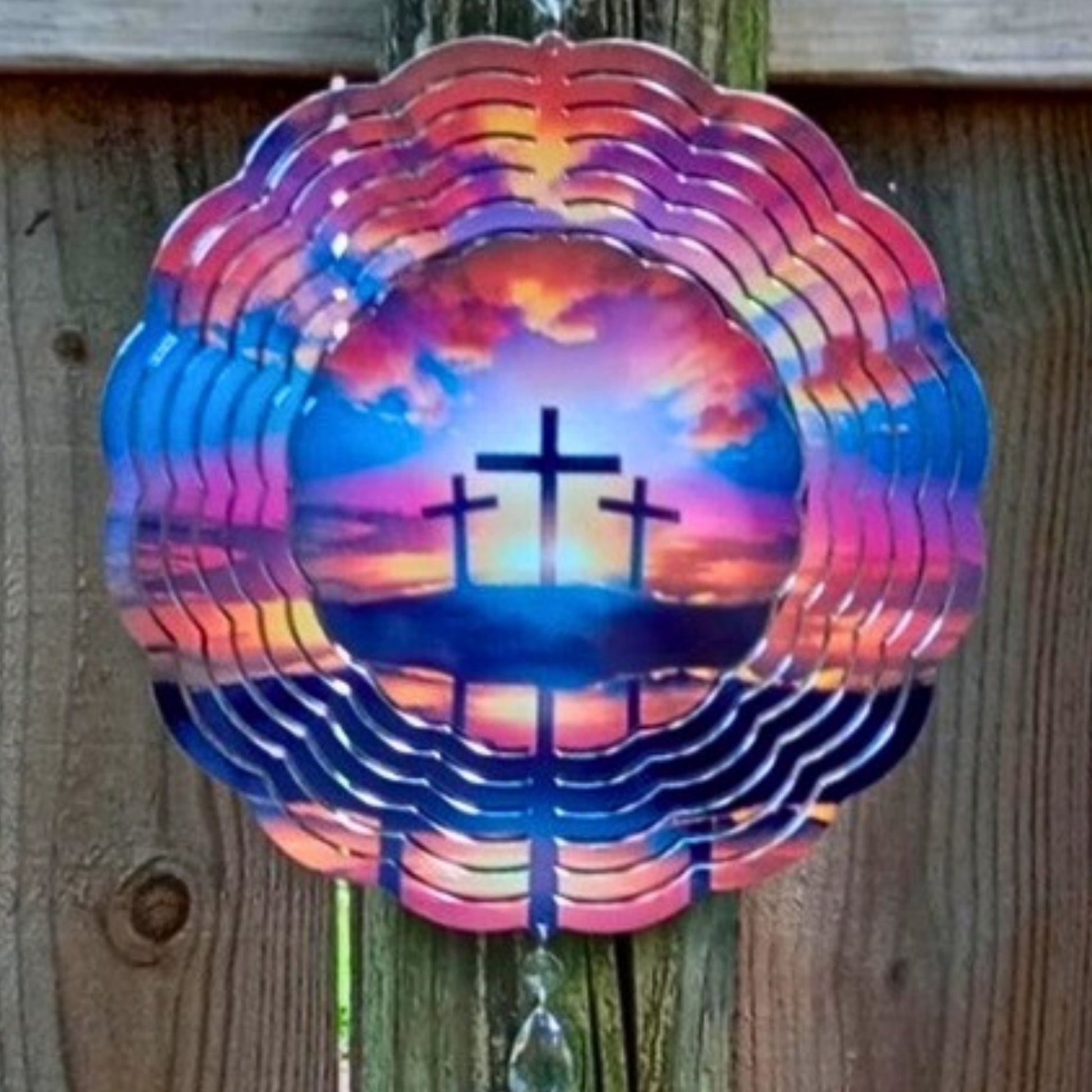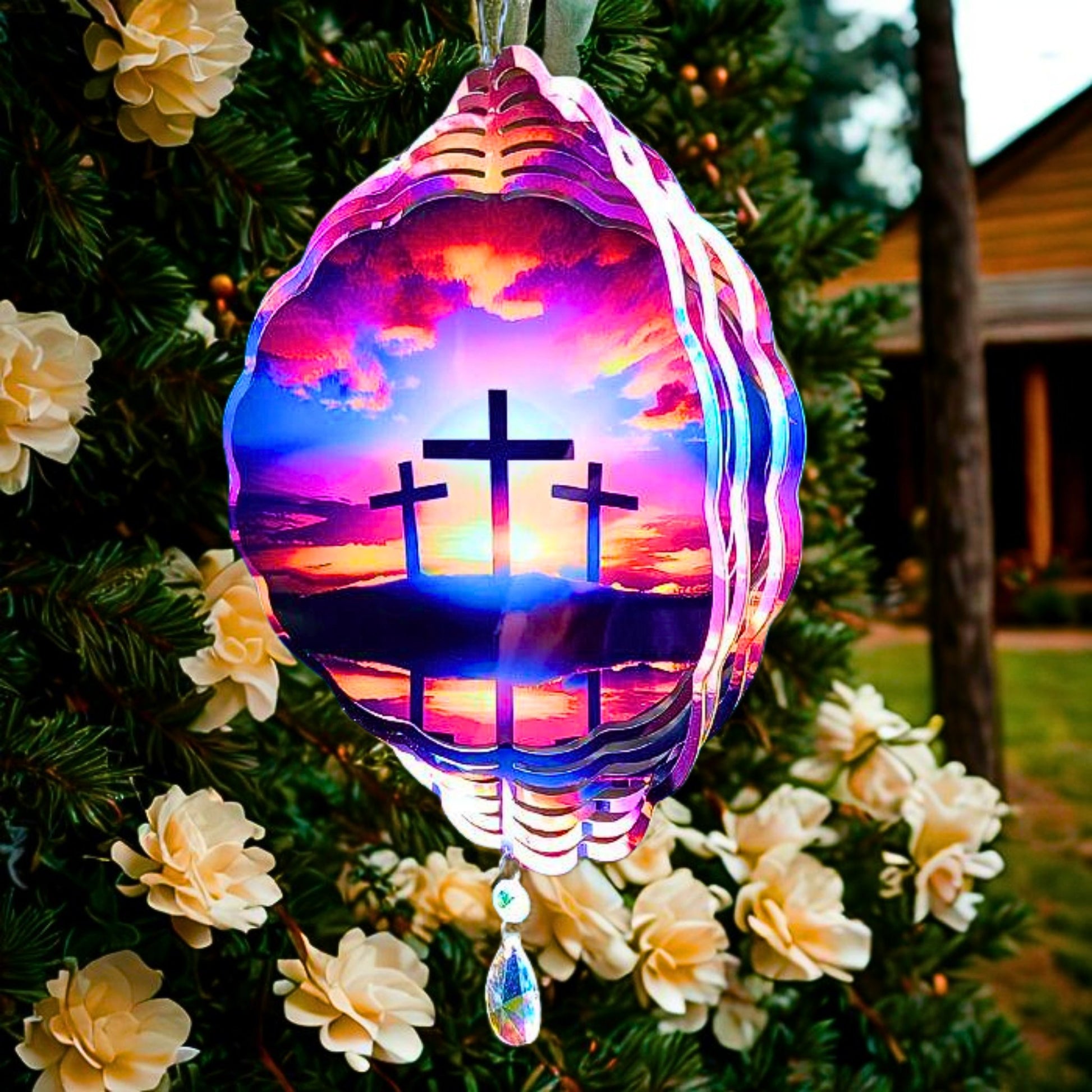 This stunning wind spinner features three crosses set against a vibrant sunrise and a sky painted with multiple colors, mirrored in the foreground. Ready to hang, it is adorned with a sparkling, faceted crystal suncatcher that adds a captivating touch as it sways gently below.